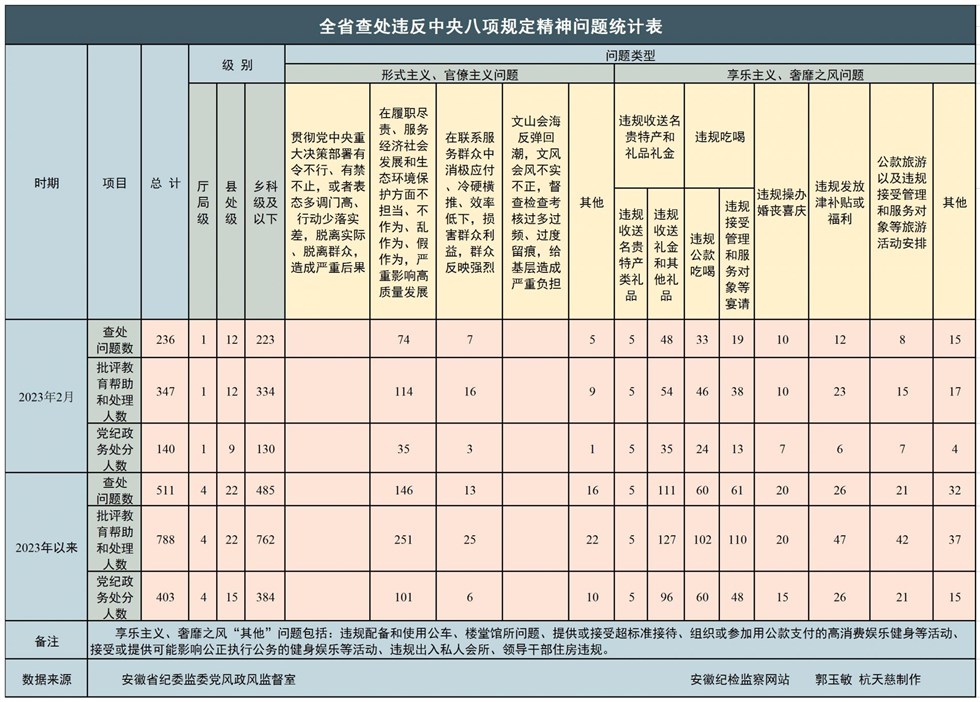 2023年2月,全省纪检监察机关共查处违反中央八项规定精神问题236起,批评教育帮助和处理347人,其中给予党纪政务处分140人,同比分别上升95.0%、93.9%、40.0%。