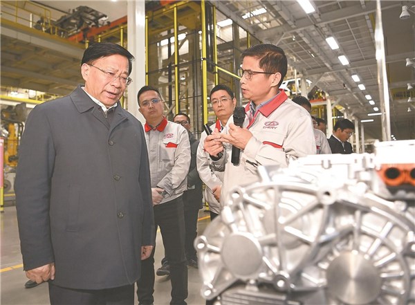 3月23日,省委书记韩俊在奇瑞公司汽车生产车间察看生产线和科技展品,听取先进生产工艺介绍。本报记者 杨 竹 摄