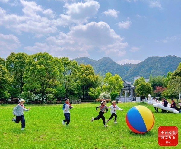 向阳草木青,明媚春光暖。春天的美,俯拾皆是。远山渐绿,盎然春季,孩童们嬉戏追逐,开怀大笑,那是春天的呢喃。(浙江省台州市椒江区纪委监委供 周佳 摄)