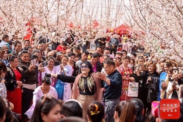 眼下,新疆维吾尔自治区库车市10万亩杏花绽放,在牙哈镇托克乃村的百亩杏园内,游客纷纷前来赏花、踏青,载歌载舞欢聚一堂,感受春意盎然的美好时光。(新疆维吾尔自治区库车市纪委监委供 袁欢欢 摄)