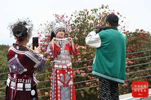 暮春时节,春暖花开,正是春游踏青的好时节,在百里杜鹃管理区姹紫嫣红的杜鹃花海里,踏青的游客们徜徉在花海中赏花拍照,游玩嬉戏,在动人美景中,感受着浓浓的春意。(贵州省毕节市百里杜鹃管理区纪检监察工委供 胡婷 摄)