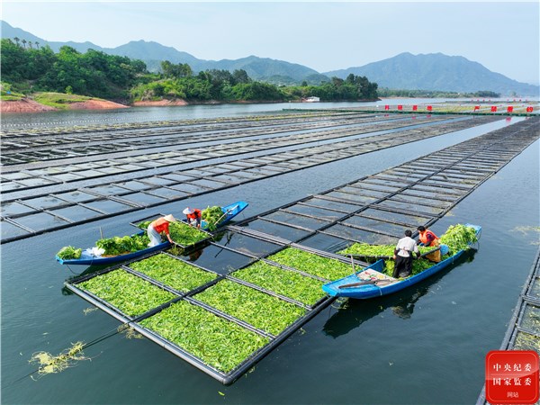 夏至时节,杭州市淳安县千岛湖镇坪山生态浮岛迎来夏季“换新”,工作人员正忙着换种应季的水上蔬菜空心菜,湖面一片繁忙景象。(杭州市淳安县纪委监委供 谢航凯 摄)
