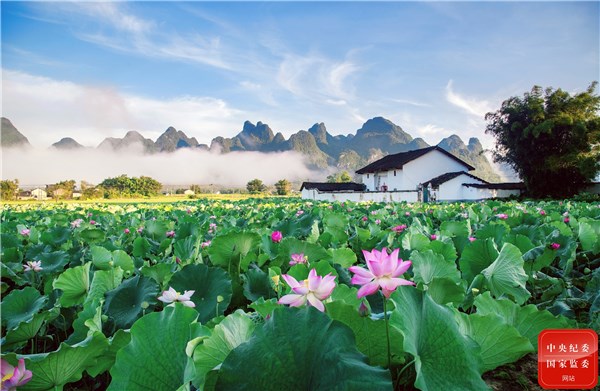 夏至时节,夏荷竞相绽放,美艳动人,与远处的白墙青瓦、层峦山黛交相呼应,定格出一幅美丽的夏日乡景图。(广西壮族自治区鹿寨县纪委监委供 刘克林 摄)