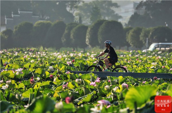 夏至时节,江西省石城县琴江镇大畲村的百亩荷花渐次开放,骑行在荷花园的小径上,感受荷花的清香,呼吸新鲜的空气,体会大自然的魅力,令人心情舒畅。(江西省石城县纪委监委供 甘士莲 摄)