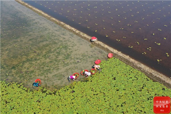 夏至时节,江苏省宝应县2万余亩芡实进入栽植期,当地农民抢抓农时栽植芡实,为实现水田丰产丰收打好基础。图为江苏省宝应县望直港镇农民在水田里移芡实秧苗。(江苏省宝应县纪委监委供 沈冬兵 摄)