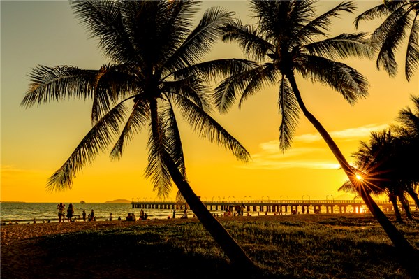 海南省三亚湾海滩绵延20多公里,是广受喜爱的夏日度假胜地,市民和游客来到这里游玩避暑,享受清凉。图为海南省三亚市三亚湾的落日美景。(海南省三亚市纪委监委供 杨宁 摄)