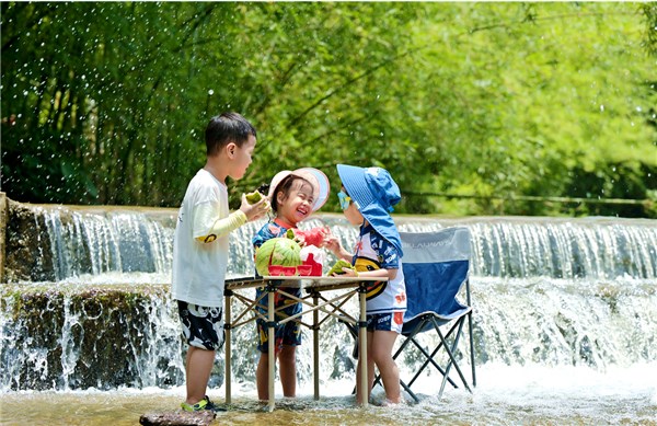 夏日里,小溪旁,三个小朋友欢聚在一起,边吃着西瓜,边聊着属于他们的小话题,乐享清凉一夏。(广西壮族自治区梧州市纪委监委供 杨犇 摄)