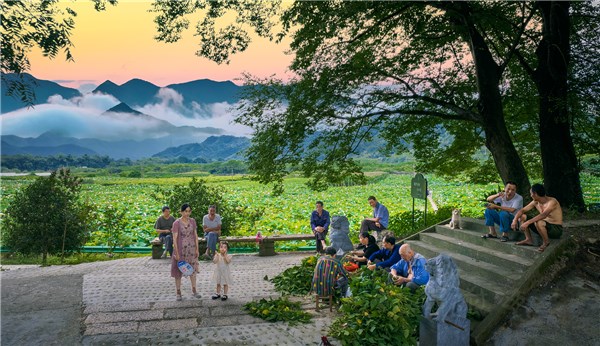 夕阳西下,炙热的气温渐渐温和。淡淡荷香借着晚风轻拂村庄每个角落。村口的槐树像绿色巨伞,乘凉的乡亲舒展笑脸,尽兴畅谈。(安徽省绩溪县纪委监委供 曹怀海 摄)