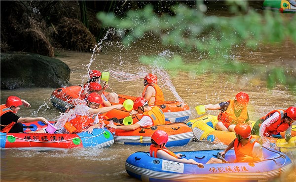 随着夏季慢慢地到来,想要躲避高温带来的烦恼,选择一场刺激又清凉的漂流必不可少。图为重庆市巴南区圣灯山镇佛影峡漂流景区里人们漂流戏水,享受夏日的清凉。(重庆市巴南区纪委监委供 吴刚 摄)