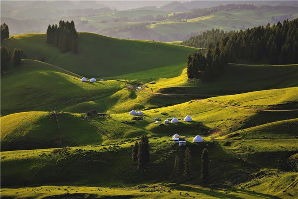 绿树阴浓夏日长,碧翠的青草与白色毡房交相辉映,成群的牛羊悠闲地吃着青草,构成一幅如诗如画的田园画卷,让人心旷神怡。(新疆维吾尔自治区阿克苏地区拜城县纪委监委供 李游 摄)