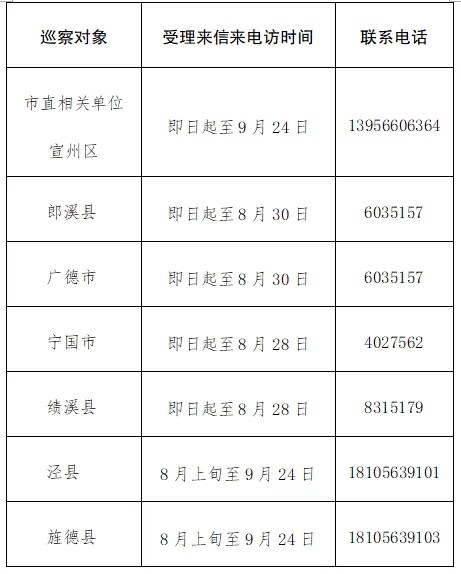 全市城市绿化工程领域专项巡察已正式启动,总体时间为7月中旬至9月下旬,巡察期间受理来信来电来访,重点是全市绿化工程领域违反政治纪律、组织纪律、廉洁纪律、群众纪律、工作纪律和生活纪律等方面的举报和反映。具体对象的巡察时间及巡察组联系方式如下: