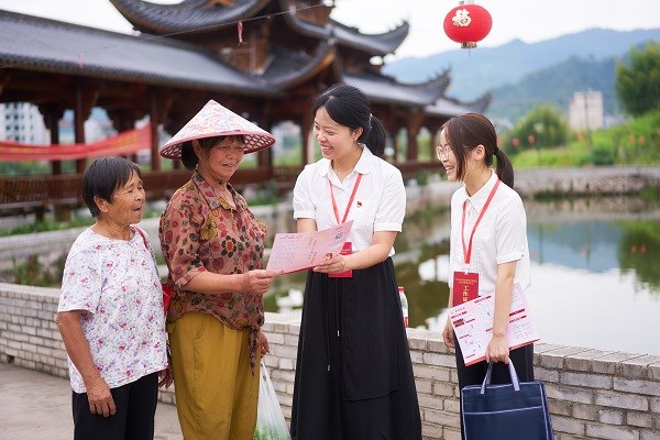 浙江省永康市纪委监委以小微权力监督平台延伸监督触角,紧盯农村集体“三资”管理和侵害群众利益等问题,一键监督助推乡村治理提质增效。图为该市纪检监察干部在岩后村向群众宣传“监督一点通”平台使用指南。(浙江省永康市纪委监委供 王晖 摄)