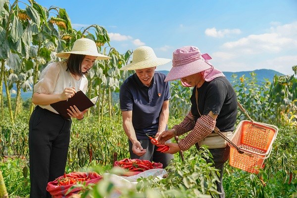 云南省昆明市晋宁区纪委监委深入一线开展监督检查,精准摸排制约乡村振兴发展瓶颈,监督推动解决群众急难愁盼问题。图为该区纪检监察干部向种植户了解重点产业政策落实情况。(云南省昆明市晋宁区纪委监委供 温冉 摄)