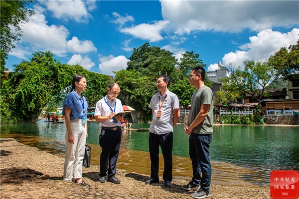 广西壮族自治区阳朔县纪委监委紧盯关键节点,组织纪检监察干部深入各大景区、农家乐、酒店等重点场所,全面排查公款旅游、违规吃喝、公车私用等问题线索,驰而不息纠“四风”树新风。图为该县纪检监察干部赴遇龙河景区了解相关情况。(广西壮族自治区阳朔县纪委监委供 夏立慧 摄)