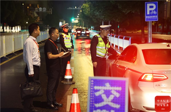 湖南省沅江市纪委监委严查党员干部、公职人员饮酒驾驶,并深挖酒驾背后隐藏的违规吃喝等“四风”问题,对案件处置过程中隐瞒包庇、说情抹案等违纪违法问题严肃查处。图为9月22日晚,该市纪检监察干部与交警联动开展酒驾醉驾专项检查。(湖南省沅江市纪委监委供 盛拥军 摄)