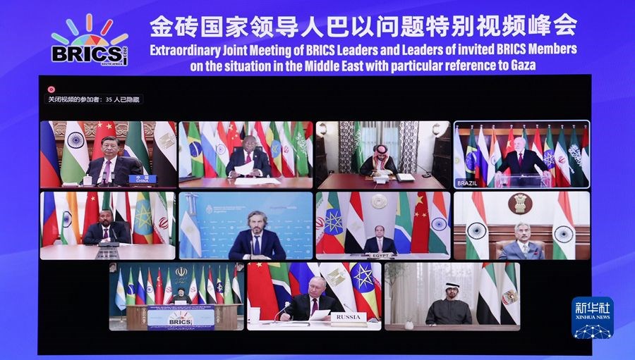 11月21日晚,国家主席习近平出席金砖国家领导人巴以问题特别视频峰会并发表题为《推动停火止战 实现持久和平安全》的重要讲话。