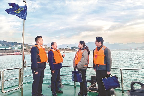 湖北省秭归县纪委监委紧盯自然资源领域腐败和作风问题,将三峡库区生态修复纳入政治监督重点,以有力监督守护三峡库区绿水青山。图为该县纪检监察干部在三峡大坝上游水域了解相关情况。郑玉涵 摄