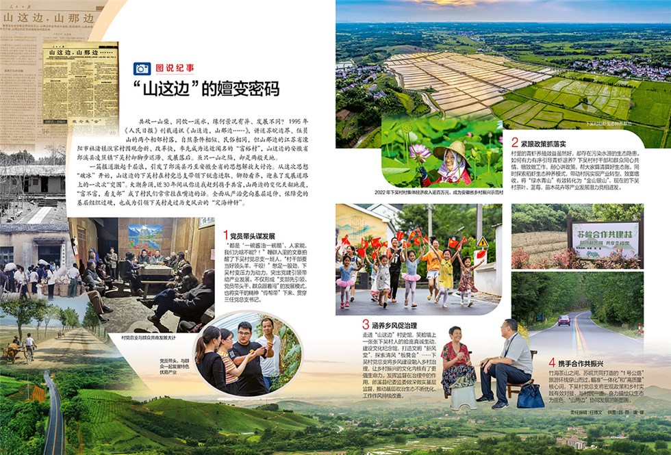一篇报道激起千层浪,引发了郎溪县乃至安徽全省的思想解放大讨论。从这次思想“破冰”开始,山这边的下吴村在村党总支带领下锐意进取、铆劲看齐,迎来了发展道路上的一次次“突围”。大潮奔涌,近30年间从你追我赶到携手共富,山两边的变化天翻地覆,“富不富,看支部”成了村民们常常挂在嘴边的话。全面从严治党向基层延伸、保障党的基层组织过硬,也成为引领下吴村走过历史风云的“定海神针”。