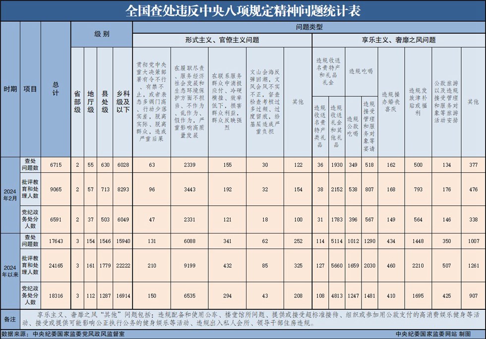 2024年2月全国查处违反中央八项规定精神问题6715起
