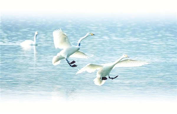 图③:位于山西省运城市的平陆县黄河湿地生态环境持续向好,吸引众多鸟类前来栖息。图为白天鹅在湿地嬉戏。 图片来源:视觉中国