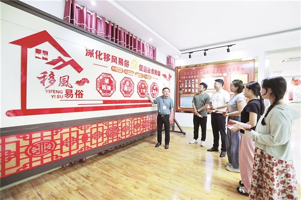 江苏省盱眙县纪委监委坚持从严教育管理党员干部,通过加强教育引导、签订承诺书等方式,提醒广大党员干部在社会交往中注意言行举止,带头维护公序良俗。图为该县纪委监委工作人员借助腊塘社区新风教育馆对年轻党员干部开展遵守公序良俗专题教育。蒋继伟 摄