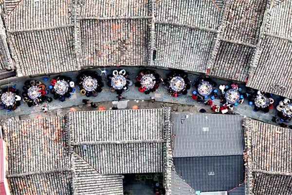 新春佳节,安徽省宁国市千年古镇胡乐司一年一度的“老街长桌宴”如约而至。来自各地的朋友汇聚一起,品尝美味佳肴,畅意开怀。节日与美食的碰撞,让喜庆气氛更加浓烈。(安徽省宣城市宁国市纪委监委供 吴乐 摄)