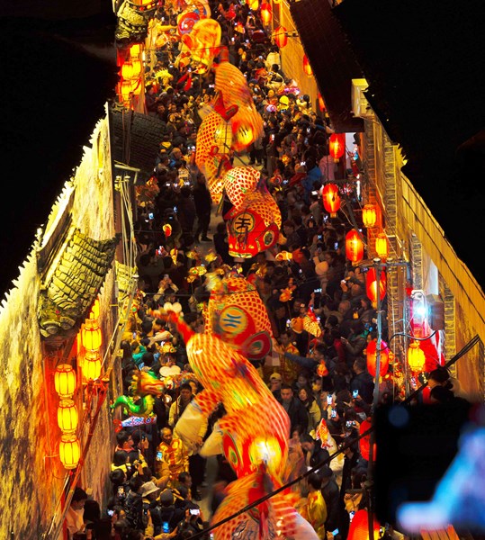 夜幕降临、华灯初上,人潮涌动的皖南小城街头,一场特色的鱼灯舞表演点燃新春氛围,表演者手持鱼灯穿梭于城市的大街小巷,人们在流光溢彩的鱼灯舞中祈愿新的一年风调雨顺、五谷丰登。(安徽省广德市纪委监委供 易成 摄)