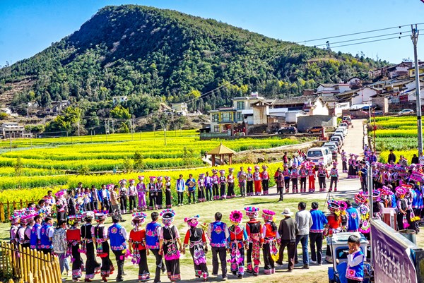 在彝族左脚舞的发源地云南省牟定县蟠猫乡,当地群众身着彝族盛装,载歌载舞,生动诠释着当地春节的独特韵味。(云南省牟定县纪委监委供 段绍东 摄)