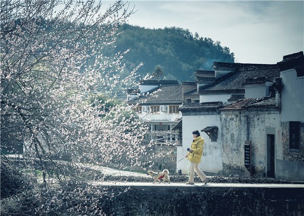 皖南小镇被细雨浸润,古桥上,一人牵着狗悠然漫步,步伐从容。桥边花朵萌动,嫩蕊初绽,星星点点,与黛瓦白墙相互映衬,勾勒出一幅宁静美好的春日画卷。(安徽省泾县纪委监委供 梅书玲 摄)
