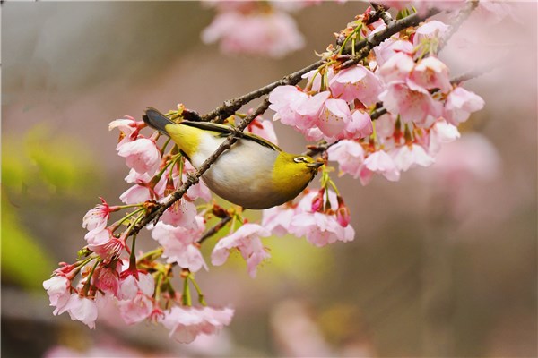 雨水时节,细雨涤尘,万物萌新。绣眼鸟轻灵展翅,在花朵间谱写一曲生动的自然协奏曲。(河南省郑州市上街区纪委监委供 崔安华 摄)