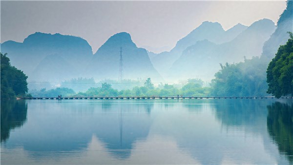 桂林市沙子镇杨家洲浮桥横跨在如镜的茶江水面,连接着两岸的葱郁,远处山峦含黛,近处水波潋滟,仿佛一幅水墨丹青。(广西壮族自治区桂林市平乐县纪委监委供 刘宗保 摄)