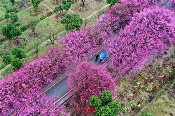 雨水时节,气温回升,贵州省遵义市余庆县观光园内的梅花绽放得愈发娇艳,吸引了当地市民赏花游玩。(贵州省遵义市余庆县纪委监委供 代鑫 摄)