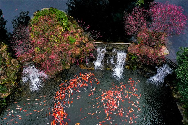 浙江省兰溪地下长河景区内的梅花渐次绽放,姿态优美,与池中鲤鱼相互映衬,吸引众多游客前来感受春天的气息。(浙江省兰溪市纪委监委供 王萍 摄)
