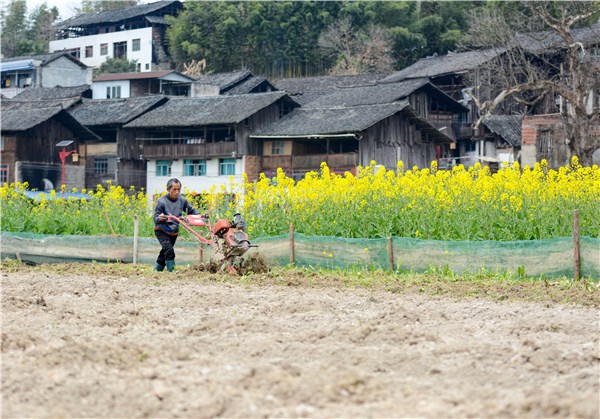 在贵州省锦屏县新化乡欧阳村,当地村民趁着春日暖阳在自家农田里忙着翻耕田土,为春种做准备。(贵州省锦屏县纪委监委供 杨函祥 摄 )