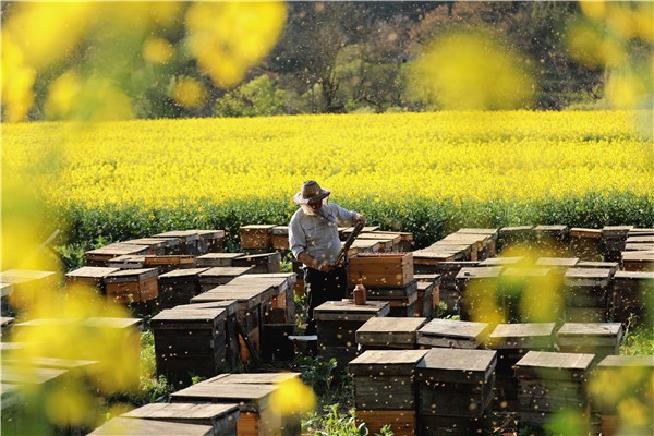 云南省曲靖市的百万亩油菜花次第绽放,金灿灿的花海吸引了养蜂人来此“安营扎寨”。养蜂人趁着晴天放蜂采蜜,酝酿甜蜜生活。(云南省马龙区纪委监委供 方俊 摄)