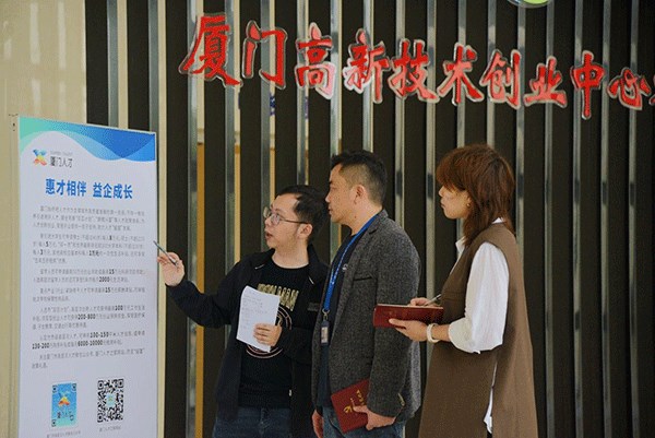 福建省厦门市同安区纪委监委依托“同企云”掌上大数据平台,通过数据比对、分析研判,精准识别惠企政策落实、惠企资金使用中存在的短板弱项,靶向监督推动营商环境持续优化。图为纪检监察干部在厦门高新技术创业中心对数据系统中的人才资金补助项目进行比对核查。(福建省厦门市同安区纪委监委 张清钰 摄)