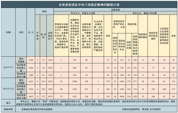 2025年5月,全省纪检监察机关共查处违反中央八项规定精神问题1399起,批评教育和处理1620人,其中给予党纪政务处分1200人。