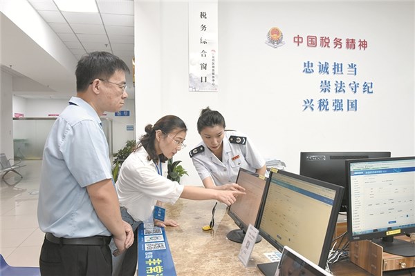 安徽省宣城市宣州区纪委监委聚焦落实税费政策、优化办税效率及服务质量开展监督,推动“减税降费”“一窗通办”等举措落地见效。图为日前,该区纪检监察干部在区政务服务中心税务综合窗口了解相关情况。 何冬霞 摄