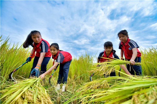 贵州省遵义市余庆县凉风小学组织学生走出教室、走向田野,体验水稻收割,培养热爱劳动、珍惜粮食的好习惯。图为凉风小学学生在体验收割水稻。(贵州省遵义市余庆县纪委监委供 周磊 摄)