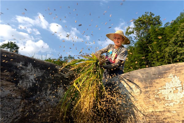 金秋十月,稻谷飘香,安徽省宣城市宣州区杨柳镇的村民兴高采烈地采撷丰收的果实。(安徽省宣城市宣州区纪委监委供 张炳赋 摄)