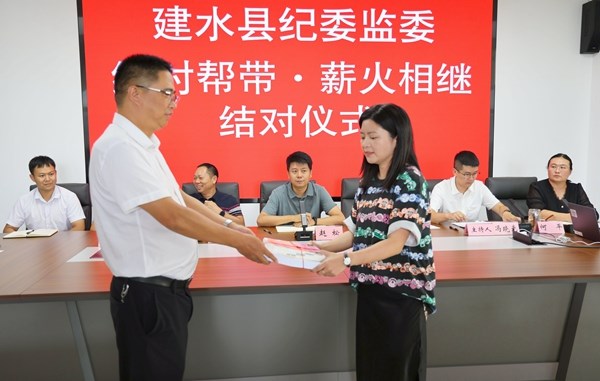 云南省建水县纪委监委采取新老结合、以老带新和“手把手”结对帮带方式,积极开展师徒结对传帮带工作,并建立健全“1+N”传帮带制度,旨在实现“开口能谈、提笔能写、接案能办、遇事能干”的干部成长目标,持续加强纪检监察业务人才储备和队伍建设。图为结对仪式上,导师向学员回赠业务书籍。(云南省建水县纪委监委 晓文 摄)