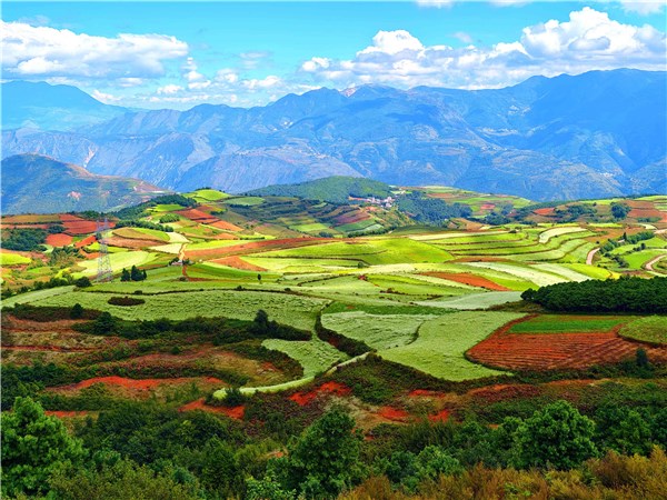 霜重叶渐红,深秋的云南省东川区红土地绘出诗意的画卷,深红的大地、金黄的谷物、盛开的野花、绿油油的农作物……犹如一块块彩色宝石镶嵌在红土大地上,呈现出五彩斑斓的美丽景象。(云南省昆明市东川区纪委监委供 吴建坤 摄)