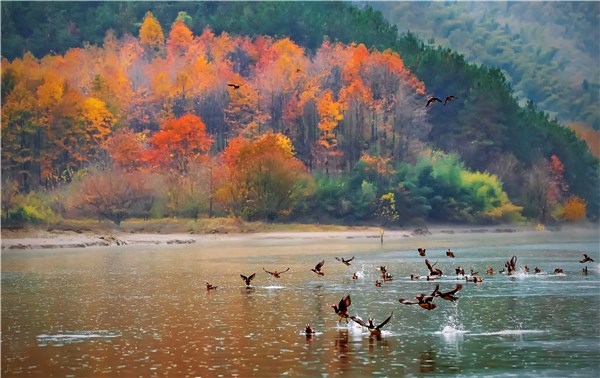 霜降时节,层林尽染,湖水澄澈。一群鸳鸯或游或飞,在斑斓秋景里,尽显灵动与诗意。(安徽省绩溪县纪委监委供 曹怀海 摄)