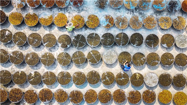 霜降染秋时,广西壮族自治区藤县新庆镇夏荣村的晒场满是暖意。阳光漫过竹匾,小青柑茶整齐排开,村民们轻轻翻晒,茶叶的醇厚与柑果的清香簌簌散开。(广西壮族自治区藤县纪委监委供 谢华婵 摄)