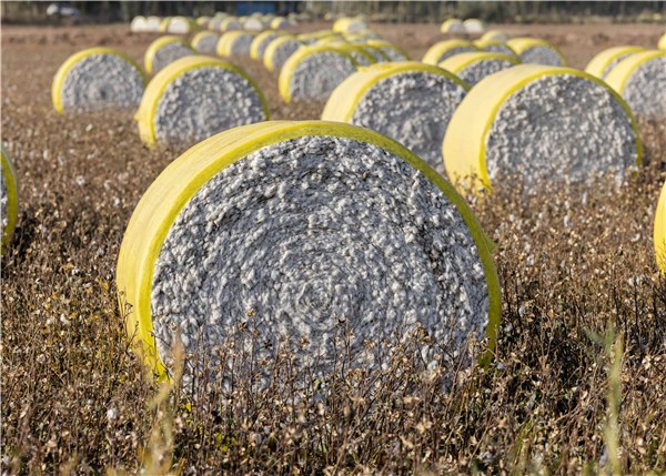 暮秋之际,棉花进入采收时节。在新疆维吾尔自治区库车市阿克吾斯塘乡的棉田里,采棉机将收割的棉花变为一个个巨大的“黄金蛋”,有序地摆放在地头,成为秋季最独特的丰收画卷。(新疆维吾尔自治区库车市纪委监委供 袁欢欢 摄)