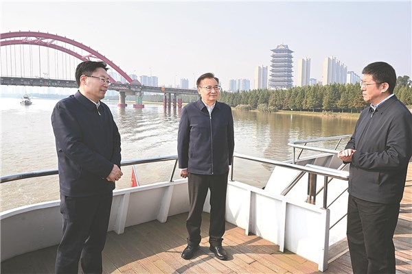 十一月十三日,省委书记梁言顺在颍河乘船察看河流水质和岸线环境,了解淮河干支流治理等情况。 杨竹 许昊 摄