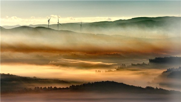 晨雾缠绕着山峦,像铺了一层暖橘色的纱。雾气在山谷间漫卷流淌,几架风车半隐半现,正慢悠悠地转动,便是初冬里最美丽的景致。(云南省曲靖市马龙区纪委监委供 龚礼俊 摄)