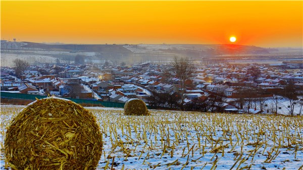 小雪时节,广阔的黑土地披上了银装,旭日点亮了金黄的天空,打包的秸秆衬托着整齐的村庄,成就了冬日里北国的独特风光。(黑龙江省鸡东县纪委监委供 刘春平 摄)