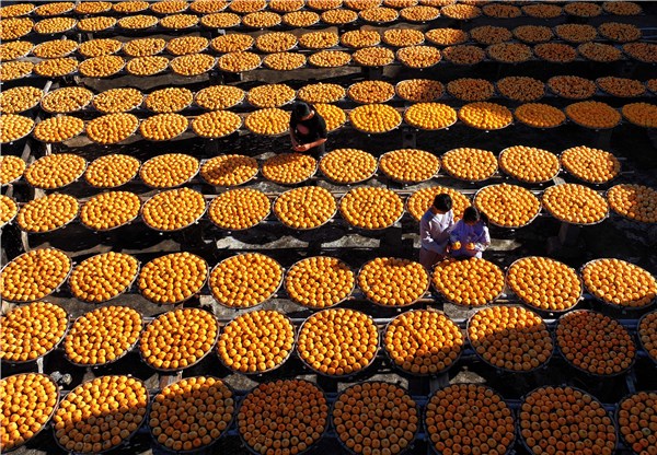 广西壮族自治区恭城瑶族自治县的农户利用晴好天气制作柿饼,房前屋后晒满了金灿灿的柿子,在光与影的错落间铺成金色织锦。(广西壮族自治区恭城瑶族自治县纪委监委供 李茂香 摄)