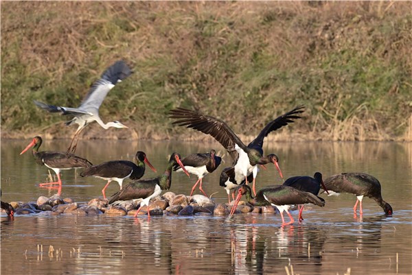 大雪节气,归来过冬的豆雁、黑鹳在黄河湿地保护区孟津会盟段的滩涂上驻足停留。聚若浓墨点染冬寒,散如飞雪融入长河。(河南省洛阳市孟津区纪委监委供 吕晓鹏 摄)